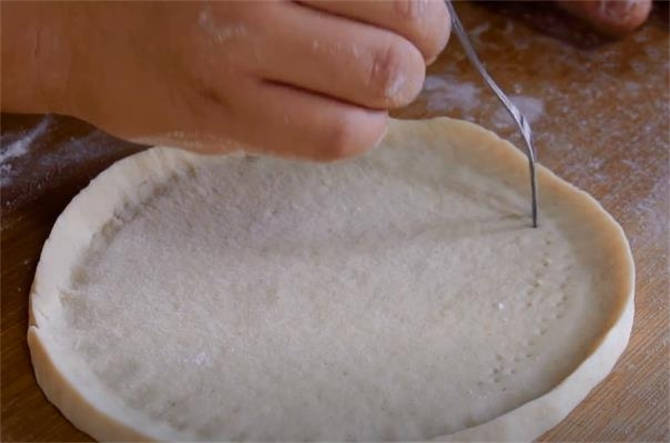5.傢裡沒有馕針,咱們就用叉子來代替瞭,戳出小孔。
