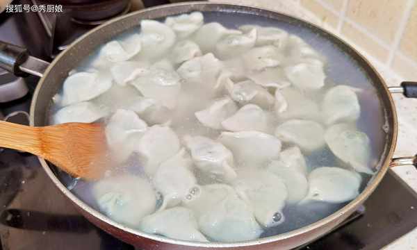5.鍋內加入適量的清水,大火將水煮開後,放入餃子,全部下鍋以後,不要著急攪動餃子,煮10秒鐘後,用漏勺或鏟子推動一下餃子,這樣可以防止餃子相互粘連或者是粘鍋底。大火煮開後,加入少許清水,再次煮開後,再加入少許清水,連續煮3個開,將餃子煮至全部浮起,餃子皮鼓起來後,用漏勺撈出,即可食用。