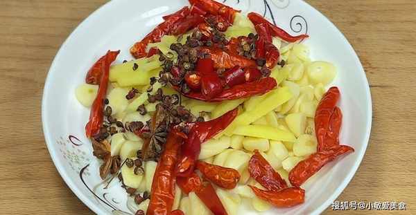 5、準備半個洋蔥切成洋蔥絲,一把大蒜,切成大蒜粒,再準備三四片薑片,改刀切成薑絲,放入一大把的幹辣椒,再準備一小把花椒,兩個八角。