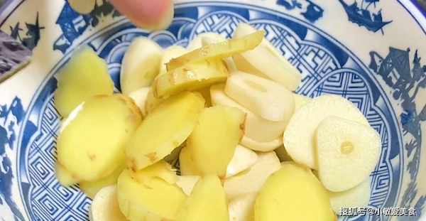 3、準備一段大蔥,斜刀切上五六片,一塊去皮生薑,切上四五片。
