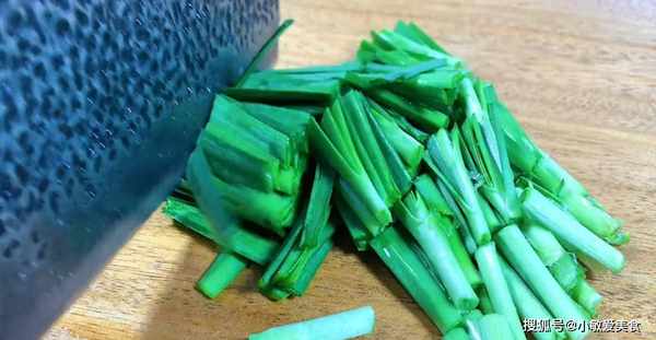 3、一小把韭菜,切成長段,切好之後也裝入碗中備用。
