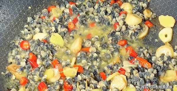 4、鍋中油熱之後倒入薑蒜煸炒出香味,下入小米辣炒出辣味,倒入螺螄肉,開大火快速翻炒,炒幹螺絲的水分,加入適量的食用鹽,少量的料酒去腥,一勺生抽,半勺蠔油,繼續開大火翻炒。