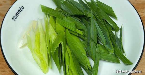 7、再準備一根蒜苗,用刀將根部給拍扁斜刀切成段,切好後裝入盤中。