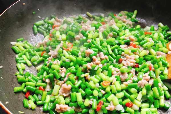 第七步:倒入肉末,加入一湯勺清水,大火翻炒均勻即可。