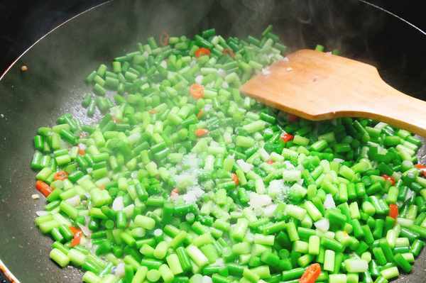 第六步:將加瞭鹽的蒜薹淘洗兩遍、瀝幹,下入鍋中,加鹽一勺,大火翻炒三分鐘左右斷生;