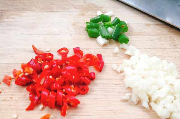 第三步:紅米椒切小圈,蔥、蒜切末備用;
