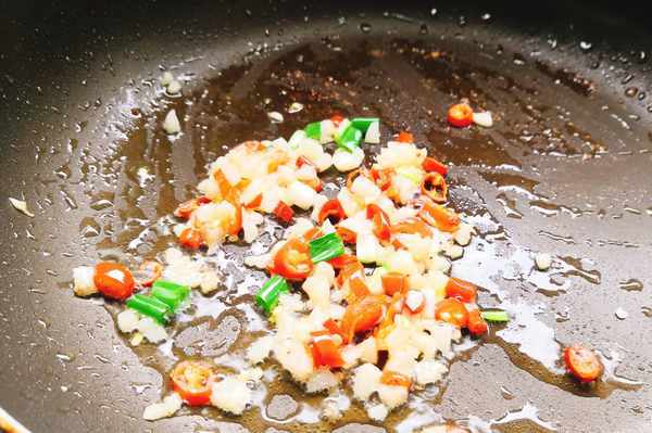 第五步:鍋中再加少許油,下蔥、蒜末和紅米椒小火煸炒出香味;