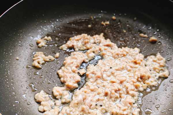第四步:鍋燒七成熱,加入兩勺油燒熱,放入醃制好的肉末,中火煸炒變色後盛出;