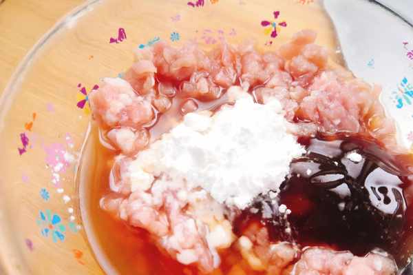 第二步:肉末加入料酒一湯勺、蠔油一湯勺、生抽老抽各一小勺、淀粉兩小勺、糖一小勺、鹽半小勺,抓勻,醃制十五分鐘;