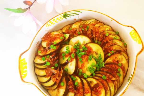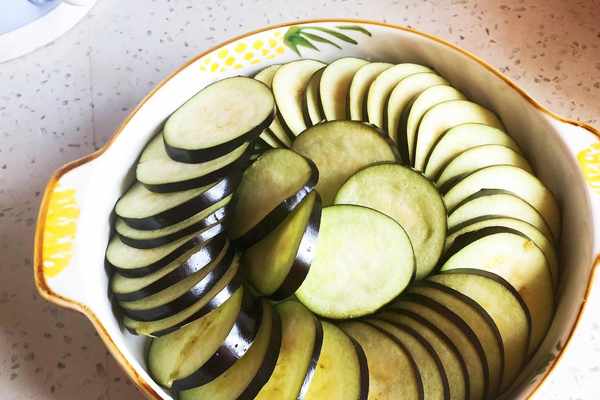 1、先將洗幹凈的茄子切成薄薄的圓片,之後,擺放在圓形盤子裡。這是一道看起來不錯實際上並沒有太大意義的程序,不顧,做菜還是要做好看一點才有食欲。為此,切什麼形狀的菜其實是很關鍵的。