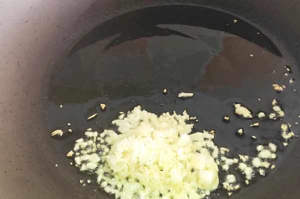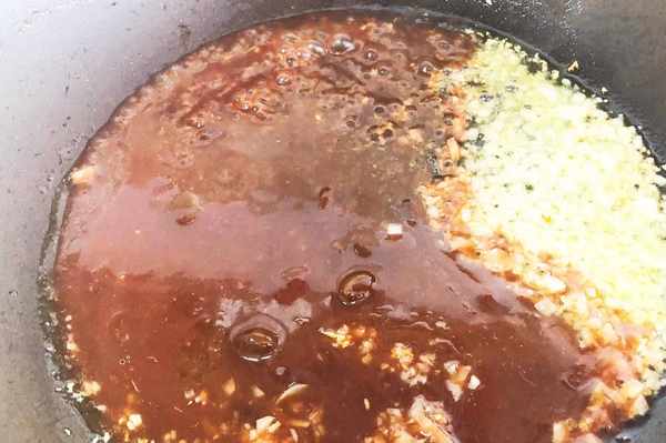 鍋裡加入油燒油,用小火煸炒蒜末出香。