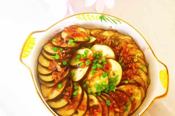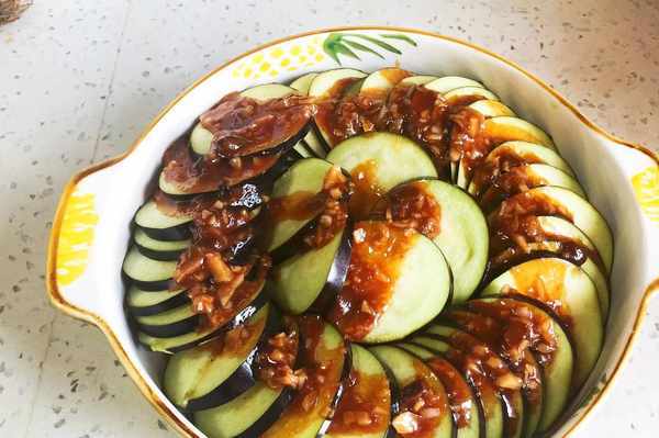 4、上鍋蒸10分鐘,茄子就熟瞭,以輕松插入筷子為宜。