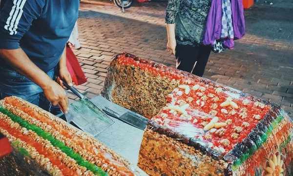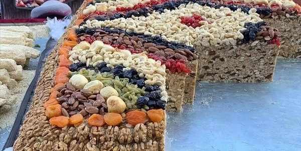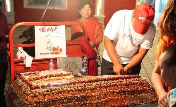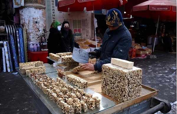 切糕在新疆被稱作“瑪仁糖”,是用各種堅果、果脯等材料熬制出來的,非常具有當地民族特色。最早作為絲綢之路商隊的補給,由於便於攜帶且保質期長,為人們提供瞭大量的營養成分。