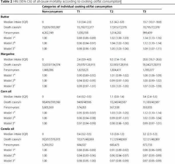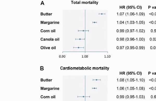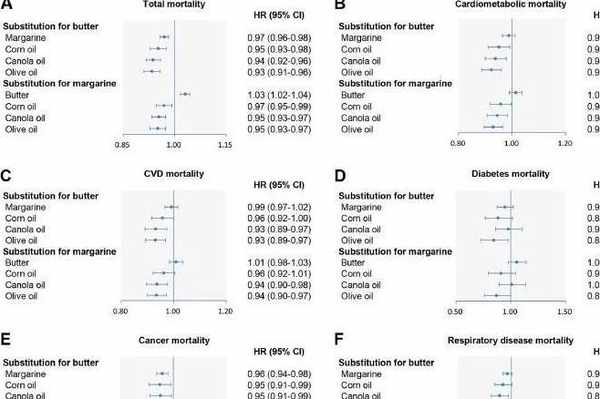 文章指出,食用黃油和人造黃油(植物油氫化而成)與較高的總死亡率和心臟代謝疾病死亡率相關,而低芥酸菜籽油、玉米油或橄欖油代替黃油和人造黃油可顯著降低相應的死亡風險。