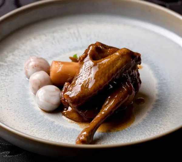 乳鴿由十餘款調料和花雕酒制成的秘制飄香汁醃制,過油後呈現出誘人的金黃色。出鍋前噴上XO白蘭地,熱力逼出油脂並混和酒香,薺菜作餡的雨花石湯圓,軟糯鮮甜,意境萬千。