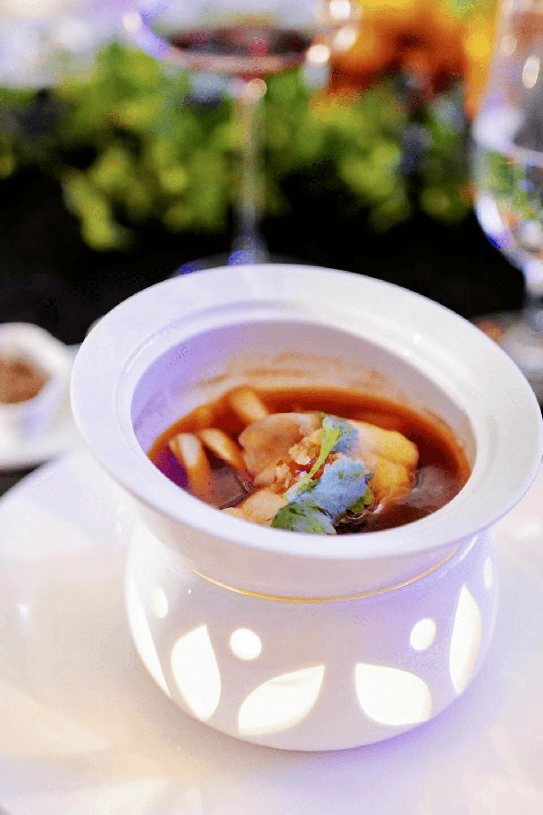 “骨纖肉膩而味甚腴,諸魚無與伍者”,鰣魚嬌嫩,鱗下富含脂肪,色白如銀,肉中多帶細刺,腴美異常。佐以5J火腿及經典龍城特制的紅湯,僅用清蒸之法即成,呈現一道清亮絕味之珍饈, 一攬整個春季的鮮甜。
