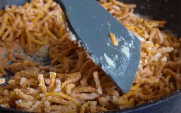 4.我們把面條放進去,關火翻炒,炒的時候再加一些白芝麻,炒一會兒這個糖就開始反沙瞭,這個時候再炒炒,就是咱們的糖霜面條瞭。