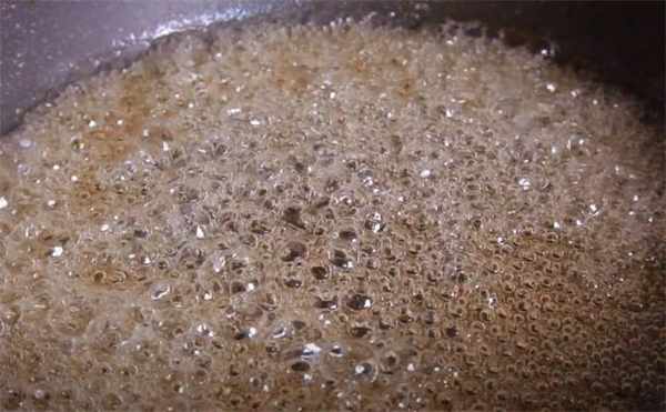 3.咱們另外起鍋熬個糖稀,倒入一些白砂糖,加一些清水進去,熬到這樣不斷冒大泡的程度。