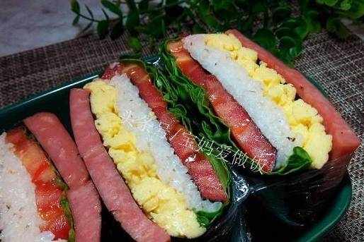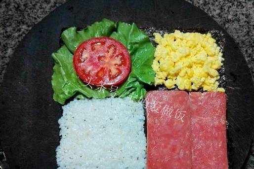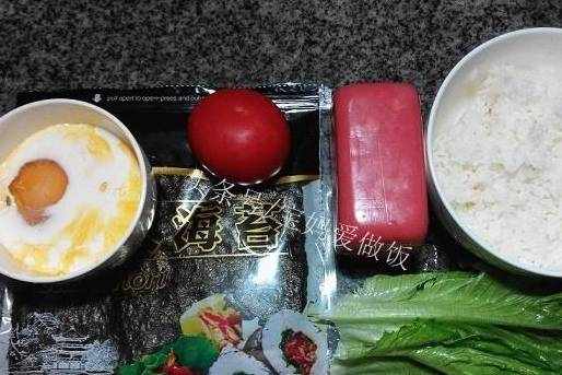 所需食材:溫熱的米飯,壽司海苔,方腿,生菜,番茄,雞蛋+純牛奶(我要炒嫩蛋,你想換成煎蛋也可以);