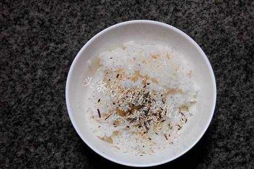 米飯加適量鹽,香油,熟白芝麻和海苔碎,拌勻備用。