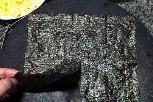 開始“組裝”:如圖所示,取一張壽司紫菜,光面朝下,用廚房剪刀從下面正中剪開一條口子,剪到中心點就停止。