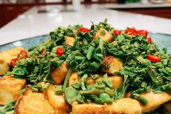制法:北豆腐切丁入鍋煎熟。咸蛋黃蒸熟碾碎,香椿焯水切末加鹽花椒油拌均勻。咸蛋黃下鍋炒香下豆腐炒拌均勻,出鍋撒上香椿末即可。