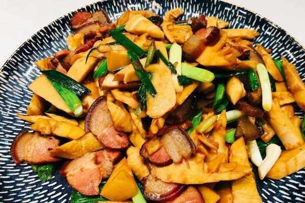 制法:蒜苗切段,春筍切塊,加鹽焯水。臘肉蒸熟切片焯水去掉咸味,鍋下底油爆香蔥蒜,下臘肉烹料酒、醬油,下春筍,放少許高湯燒3分鐘,收汁下入蒜苗炒斷生打花椒油即可出鍋。