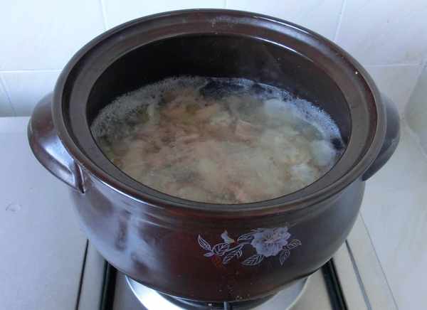 3、將瘦肉和藥材一起放入砂鍋中,加入適量清水