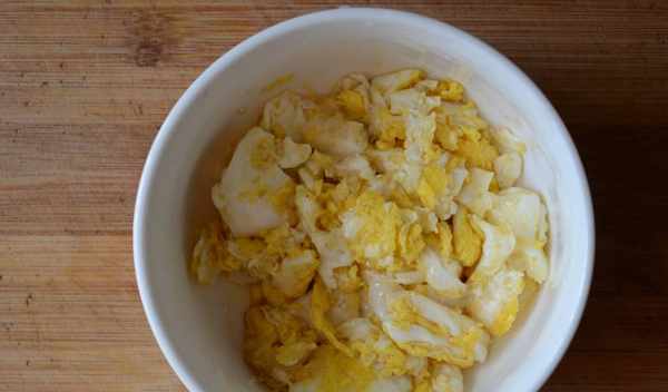 步驟4起鍋熱油將雞蛋打入鍋中,炒至凝固成散狀,盛出備用。