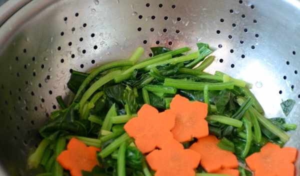 步驟3菠菜擇洗幹凈,胡蘿卜去皮切片用模具刻成花,放入燒開的水中燙30秒撈出過涼水瀝幹水分備用。