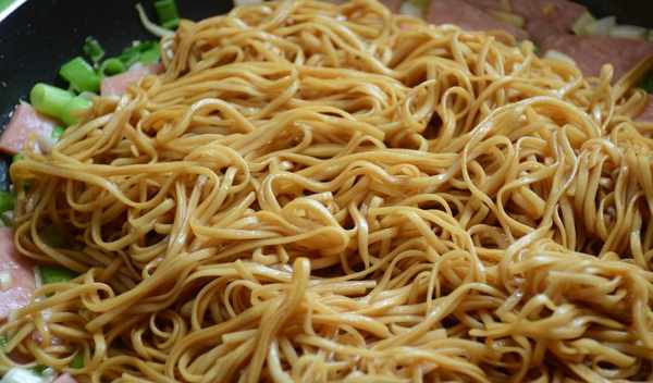 步驟7用醬油拌散的面條倒入,用筷子翻拌入味。