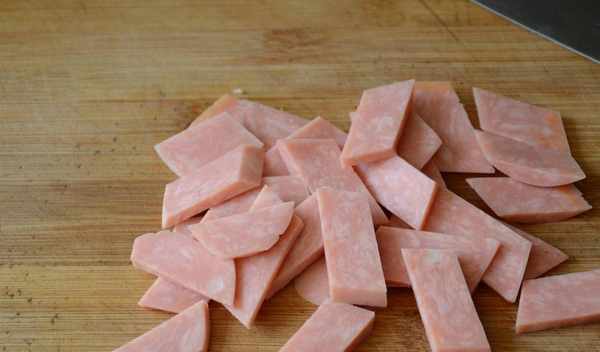 步驟1火腿腸取出切薄片,再切成小方塊。