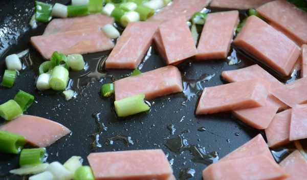 步驟6留底油放入切好的蔥和薑絲炒出香味,再將火腿腸片倒入,翻炒均勻。