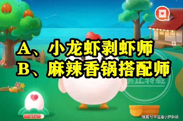 還不清楚,猜一猜:以下哪種職業在餐飲業中是真實存在的?答案的同學,選項中有兩個選擇,分別是:麻辣香鍋搭配師或者小龍蝦剝蝦師。還不清楚,哪種職業在餐飲業中是真實存在的?答案的同學,下面就一起來看看,螞蟻新村題目:猜猜哪種職業在餐飲業中是真實存在的呢?的答案解析吧。