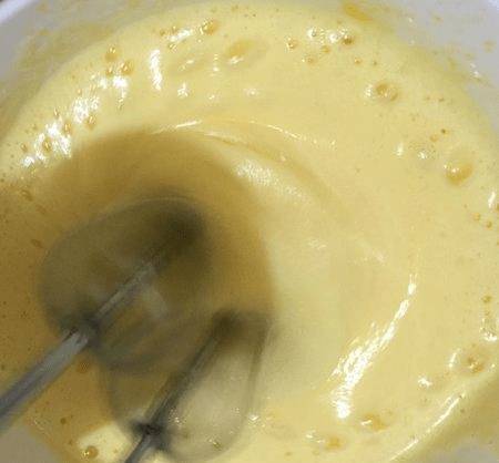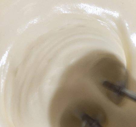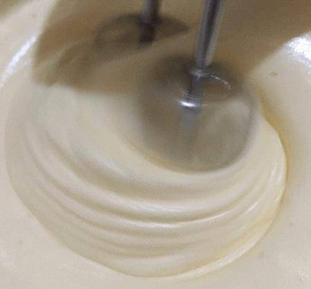 如圖所示用打蛋器打至濃稠,然後第三次加入糖。