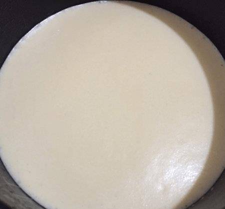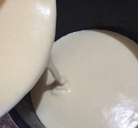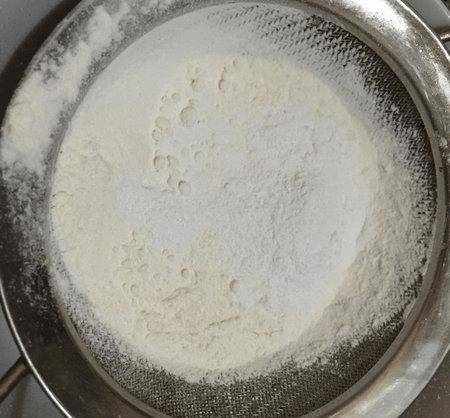 如圖所示將低糖面粉篩入牛奶中,加入食用油拌勻。