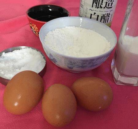如圖準備好材料,雞蛋洗凈,低筋面粉,牛奶,白糖,食用油,白醋備用。