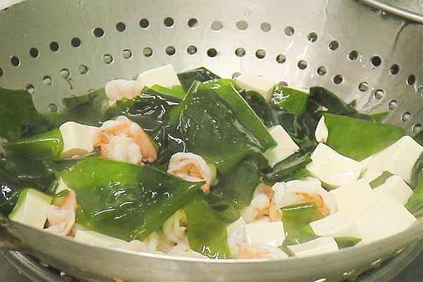 2.鍋中加入適量的清水,放入豆腐和海帶進行焯煮,去除腥味,一分鐘以後倒入蝦仁,繼續煮至蝦仁變紅,撈出來控水。
