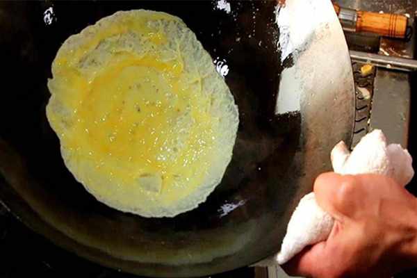 2.鍋內燒油,充分滑鍋以後倒出熱油、加入涼油,倒入一半蛋液轉動鍋攤成圓形蛋餅,定型以後翻過來,把蛋餅煎至兩面金黃倒出來,切成細絲備用。