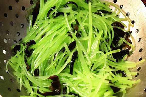 3.鍋中加入適量的清水,放入少許食鹽和植物油,大火燒開後倒入木耳、萵筍快速焯水30秒鐘,萵筍斷生以後倒出來,用清水沖洗過涼、控水備用。