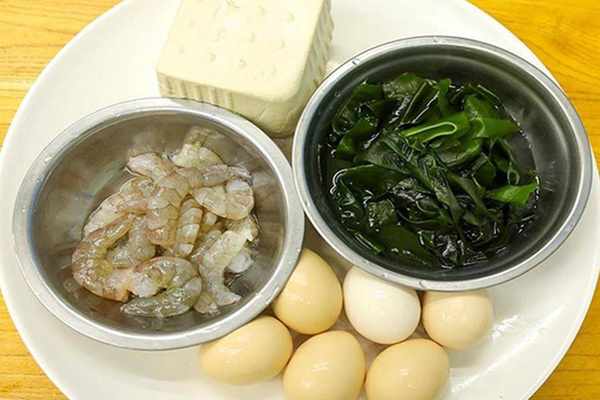 1.準備一塊嫩豆腐,切成一厘米左右的方丁;適量的鮮蝦仁,剔除蝦線、清洗幹凈;海帶洗凈、切成小段;另外再準備幾個雞蛋。