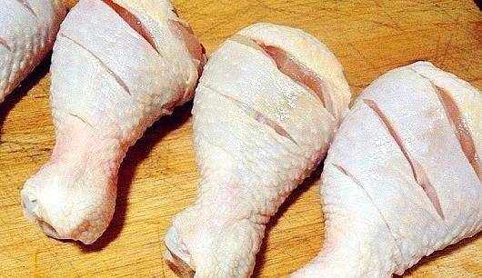 2、雞腿洗凈,在雞腿上均勻劃幾刀,盛入碗中,加入適量生抽、鹽、雞粉、料酒,戴上手套用手抓拌均勻,醃20分鐘。(別忘瞭中途轉)