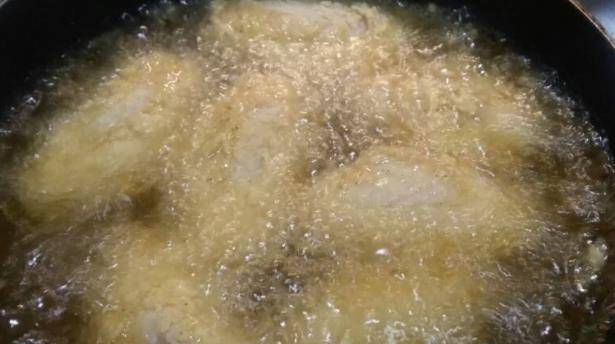 3、鍋中倒入適量的油,50%熱時,將醃制好的雞腿放入油中炸制。
