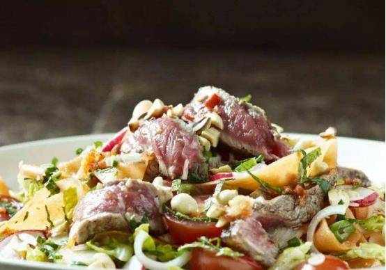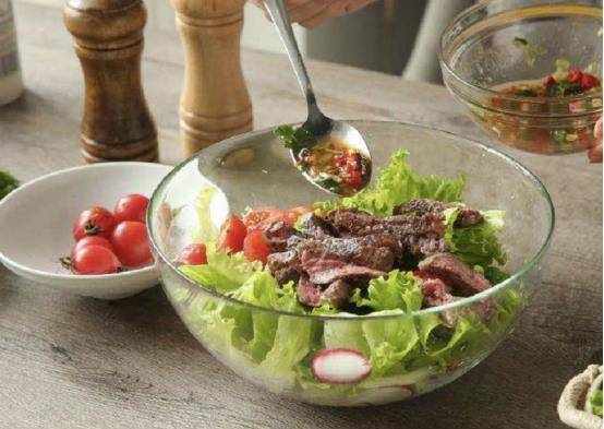 取出一個容器,將牛肉和蔬菜倒入其中,然後倒入調味汁,用工具攪拌。也可以加點薄荷葉,切點檸檬片,我們就可以完成制作瞭。也許很多人不知道魚露是什麼。其實也是一種高品質的調料,有一種咸味,真的是最適合做沙拉的。此外,我想向您介紹一些註意事項。如果買未凍的牛排,一定要等它慢慢解凍,然後再進行其他步驟。分享來瞭,看起來很好吃!