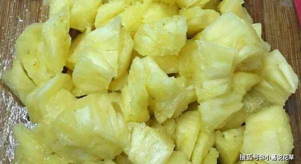 然後將菠蘿切成塊,放入鹽水中。菠蘿泡在鹽水裡會更甜。吃菠蘿時不要走到這個階段。然後將菠蘿切成小塊。如果想要更細一點,可以用攪拌機打碎,然後準備適量的冰糖。