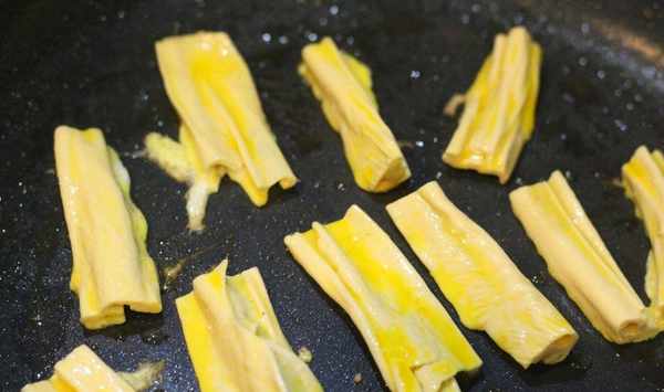 4、鍋中留下少量的油,加入準備好的腐竹下鍋,小火慢慢的煎一煎,直到腐竹表面的蛋液凝固,這樣腐竹就處理好瞭。