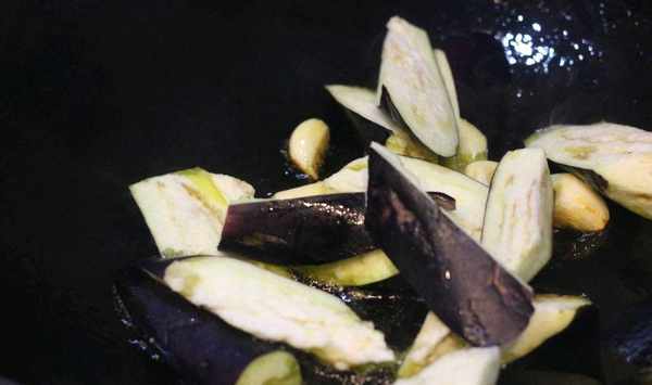 5、還是鍋中準備適量的油燒熱,先加入準備好的蒜末,炒出香味,然後加入切好的茄子,下鍋炒香,炒出茄子裡面的水汽,等到茄子變軟為止。