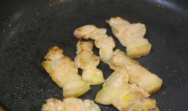 2、鍋中加入少量的油,先加入準備好的五花肉,下鍋小火煎到表面金黃,煎出五花肉裡面的油脂,這樣做好之後,既不會覺得五花肉油膩,最後成菜之後味道也會更香,風味更濃。