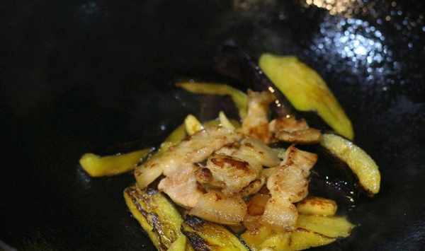 6、接著加入先前煎好的五花肉,下鍋翻炒出香味,加入蠔油,老抽,鹽,胡椒粉,糖翻炒均勻。