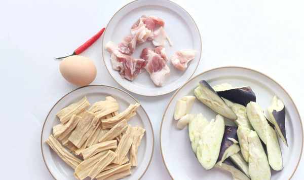 1、先準備並處理好所有需要的食材調料,所有食材都清洗幹凈,五花肉切成薄片,茄子切成小片備用,腐竹提前加入水泡軟,切成大小合適的小段。